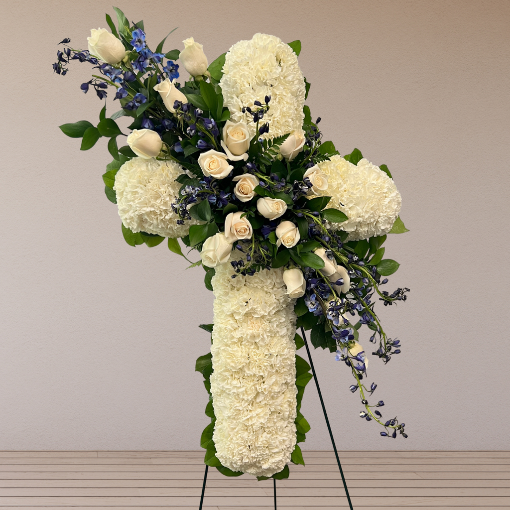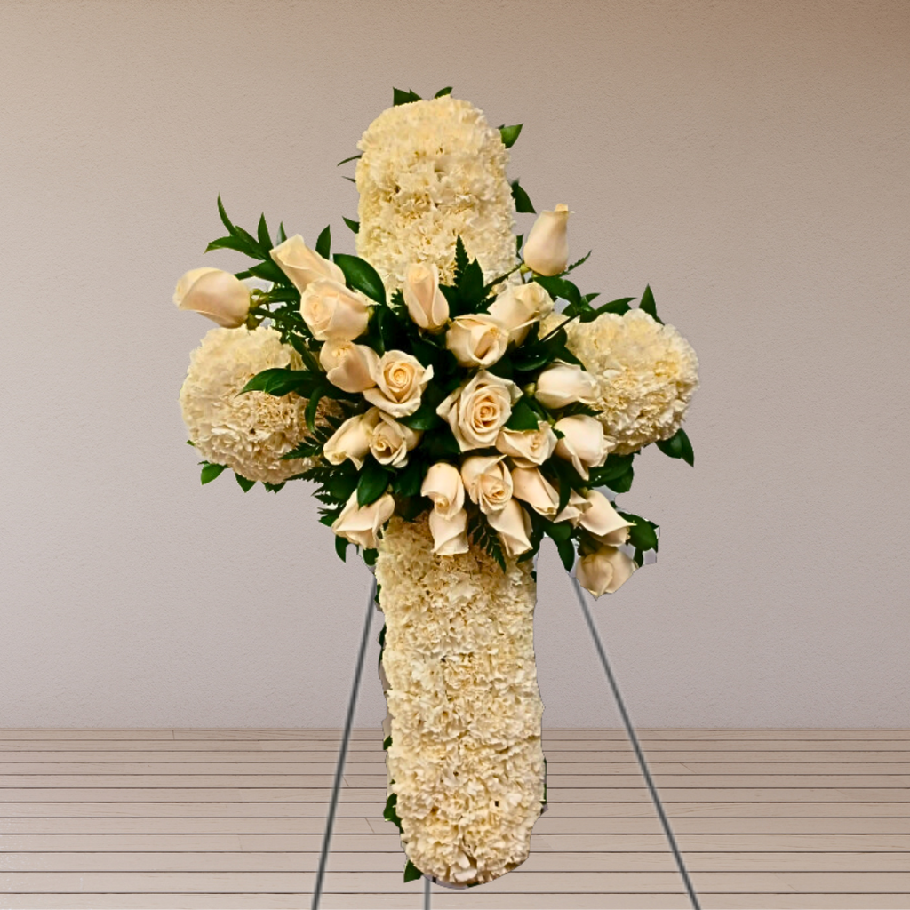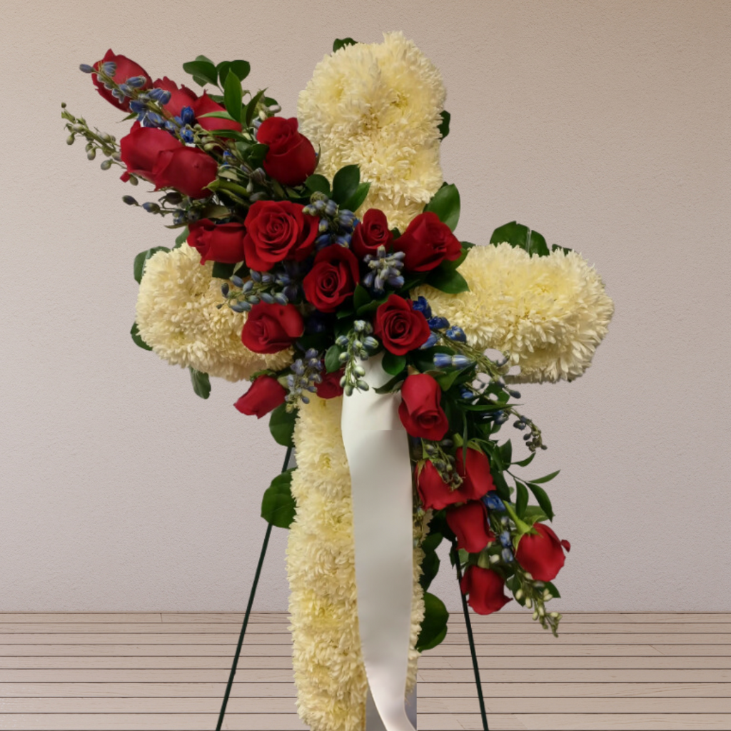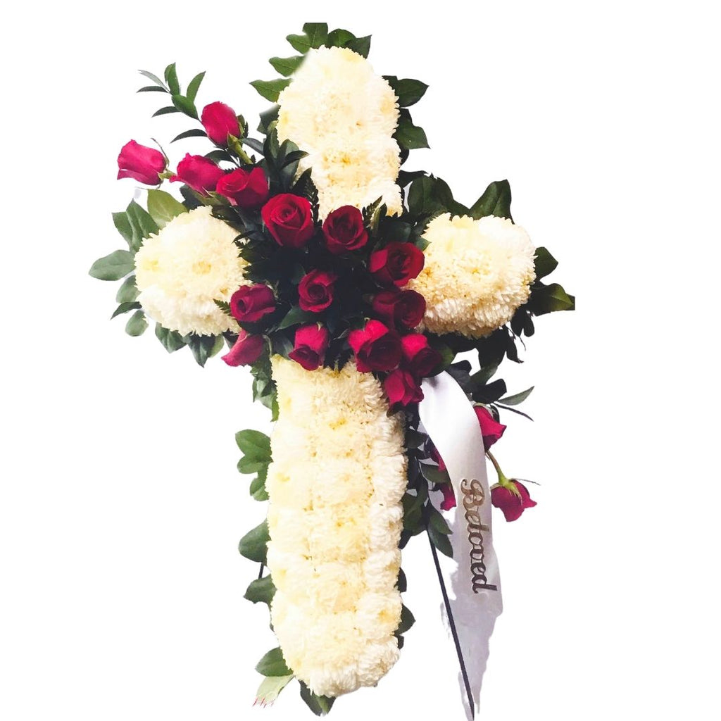 In Christianity the cross is a symbol of faith and undying love. A flower Cross is often sent to the service by a religious group or family and friends. Flower crosses can be created out of a multitude of flowers. The most common flower used is a white carnation and a red rose spray.