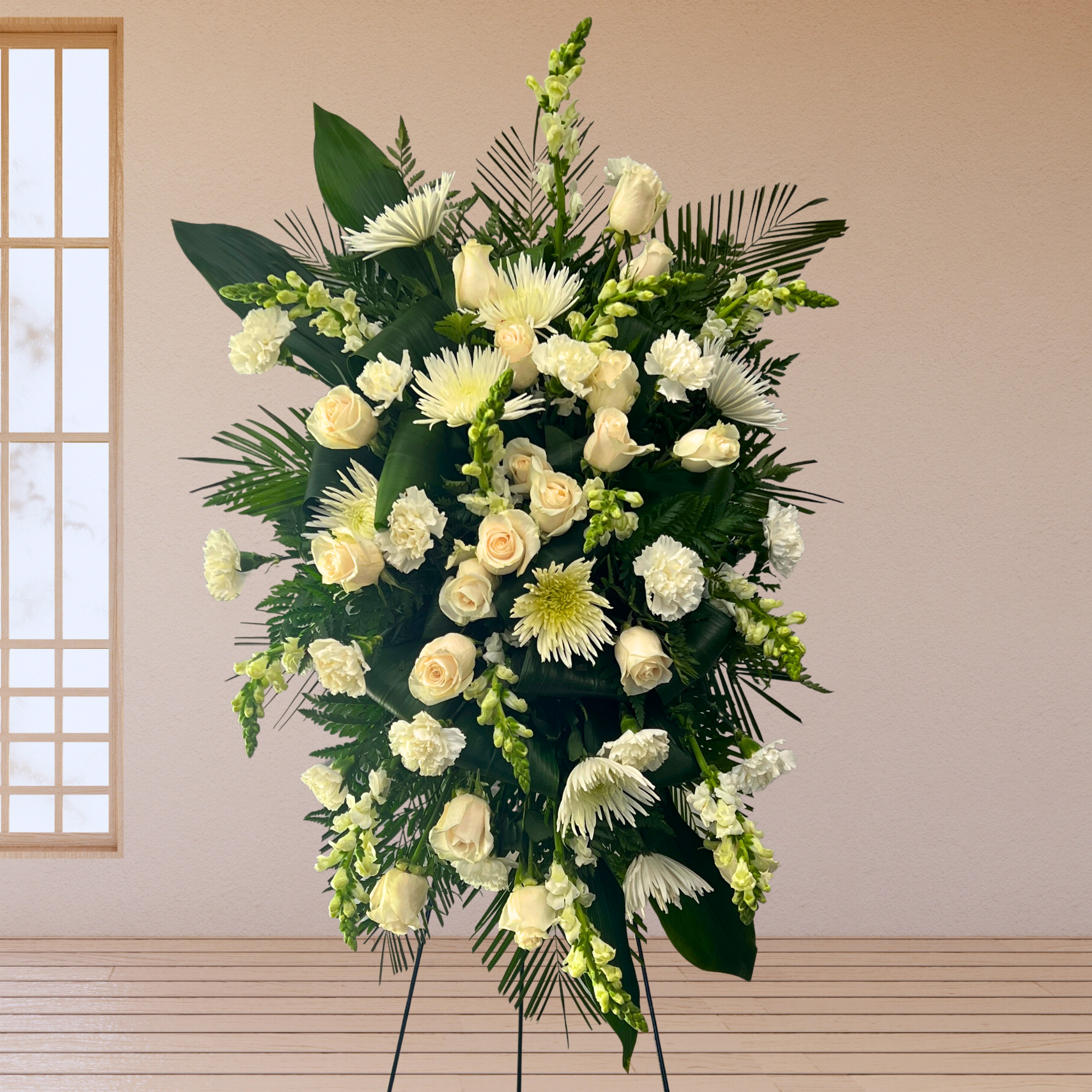 This all white, serene standing spray is composed of white Roses, white Carnations, Mums, tropical leaves, folded Aspidistra, and Snapdragons.