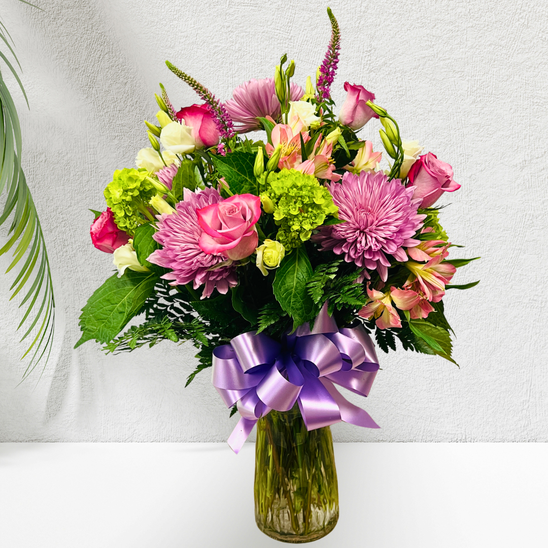 A celebration of pastel hues with purple Roses, green Hydrangea, pinks, white Lisianthus, and Veronica’s make a nicely designed garden mixture.