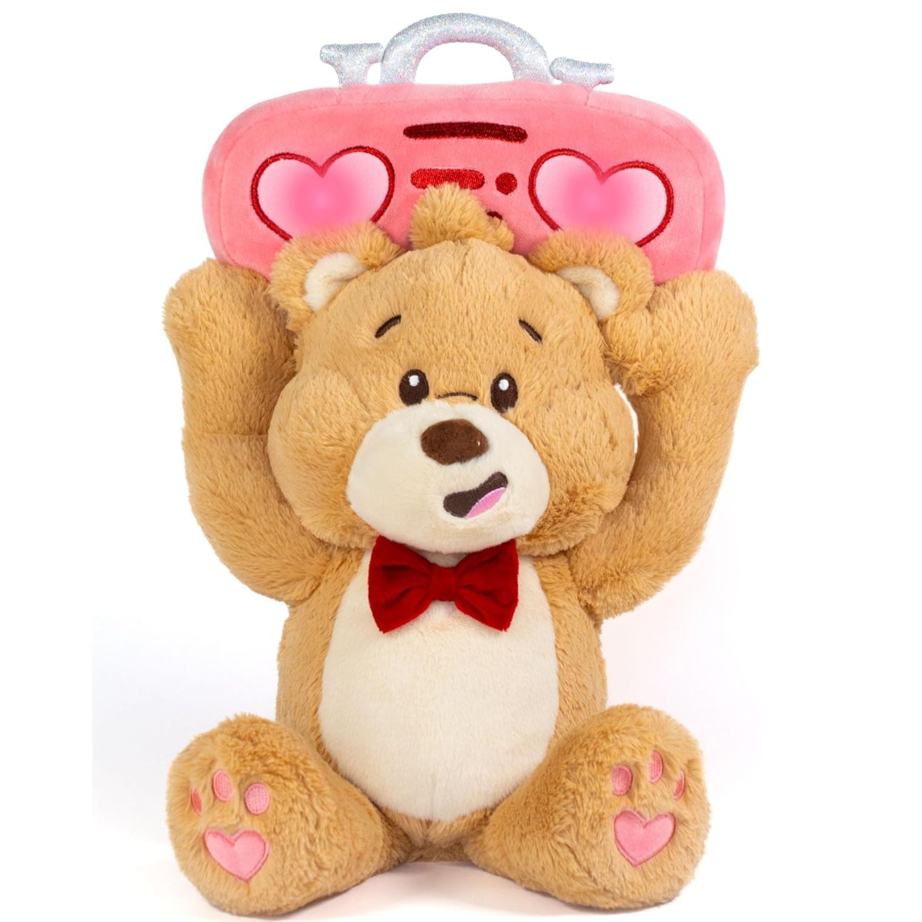 Holds a boombox that lights up! Watch as he sways side to side while singing "You Can't Hurry Love." Soft and so fun.