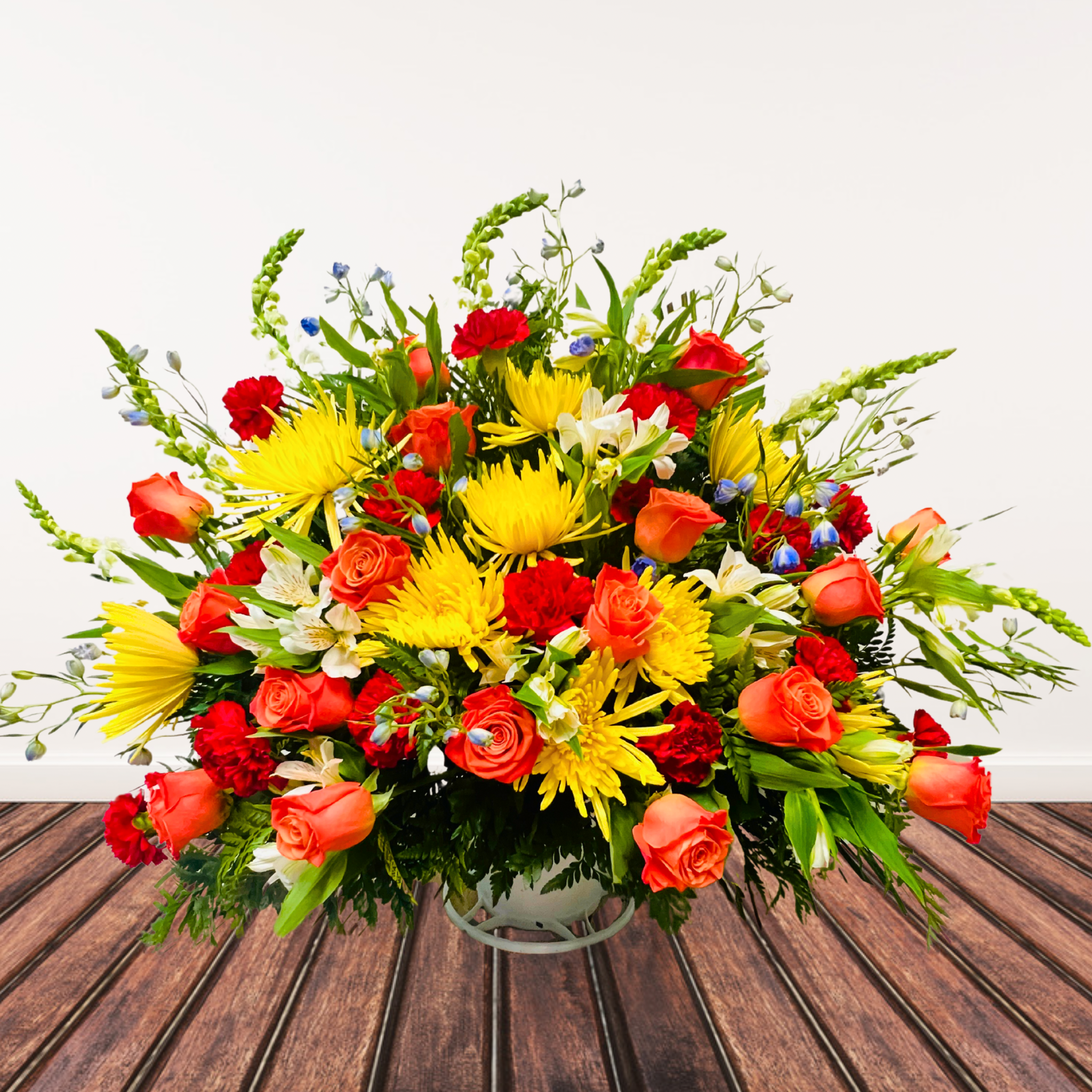 The "Bright Light Funeral Basket " is a beautiful arrangement filled with vibrant roses, carnations, and assorted  florals in warm red, yellow, orange, and white hues with a touch of blue.
