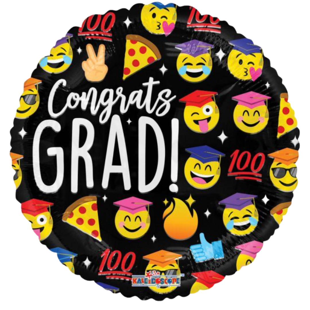 18” Round emoji and pizza patterned Helium Mylar Balloon with Congrats Grad Script.